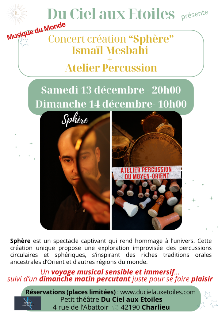 - Samedi 13 : 20h00 – CREATION « Sphère« – ☆ Ismaïl Mesbahi (percussions orientales et oud solo)
